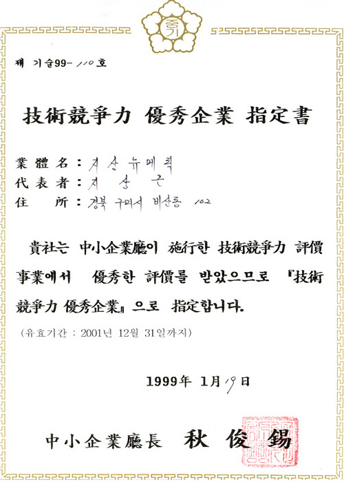 기술경쟁력 우수기업 지정서