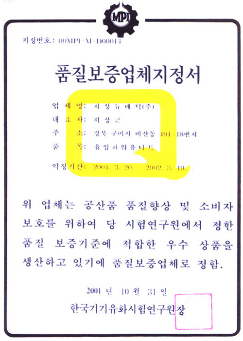 품질보증업체 지정서