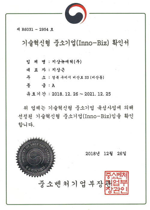 우량기술기업인증서