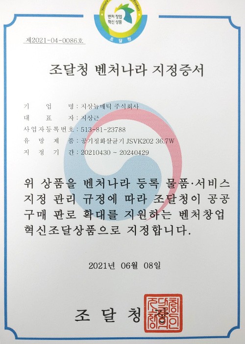 조달청벤처나라지정증서
