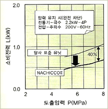 - 기존 NACHICCO의 에너지 절약 성능을 향상시킴으로써 표준 유닛에 비하여 약 40%의 에너지 절약달성 (압력유지 시, 당사비)
