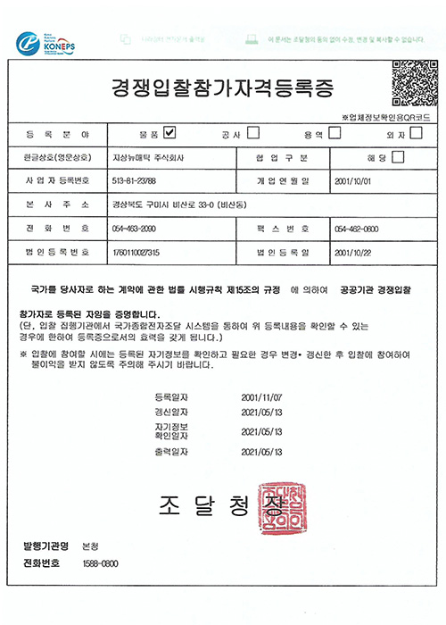 조달청벤처나라지정증서